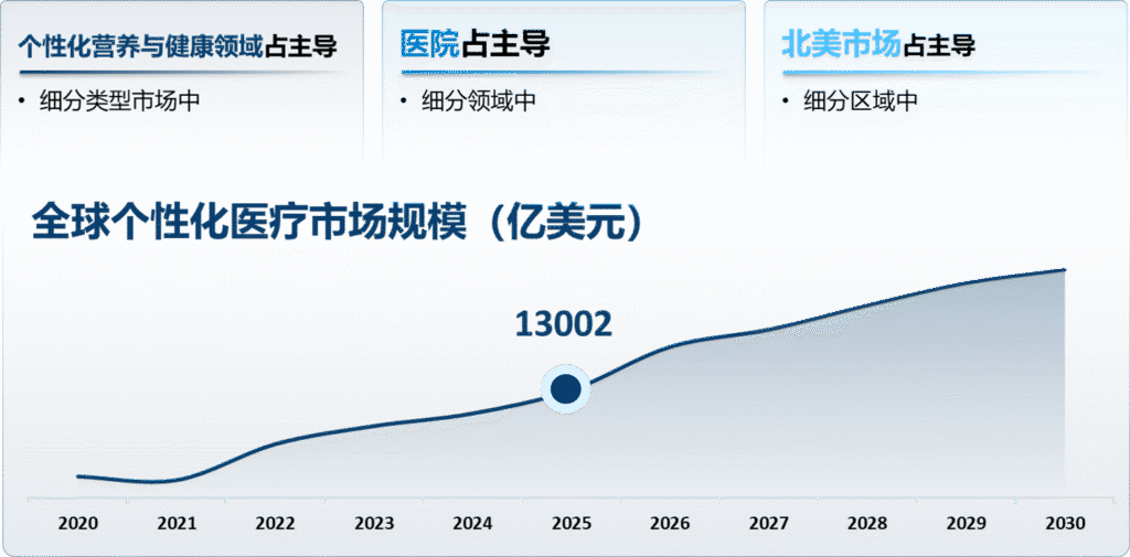 根据风铃咨询调研数据,全球个性化医疗市场到2031年价值1.3002万亿美元,2025-2031年复合增长率为8.7%。